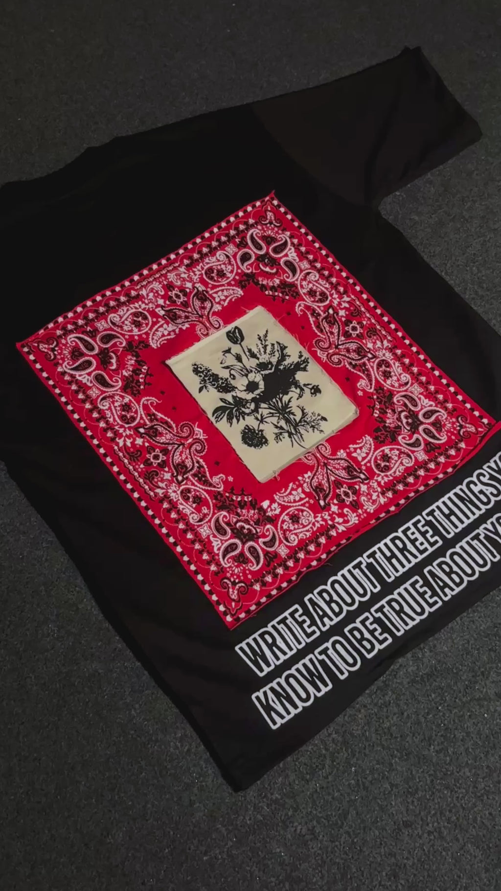 Memory, identity, and statement fuse in the True About You Tee. Framed by a vivid paisley print and centered with a delicate floral sketch, the design evokes introspection layered with street-ready impact. At the bottom, bold typography prompts a moment of self-awareness: “Write about three things you know to be true about yourself.”